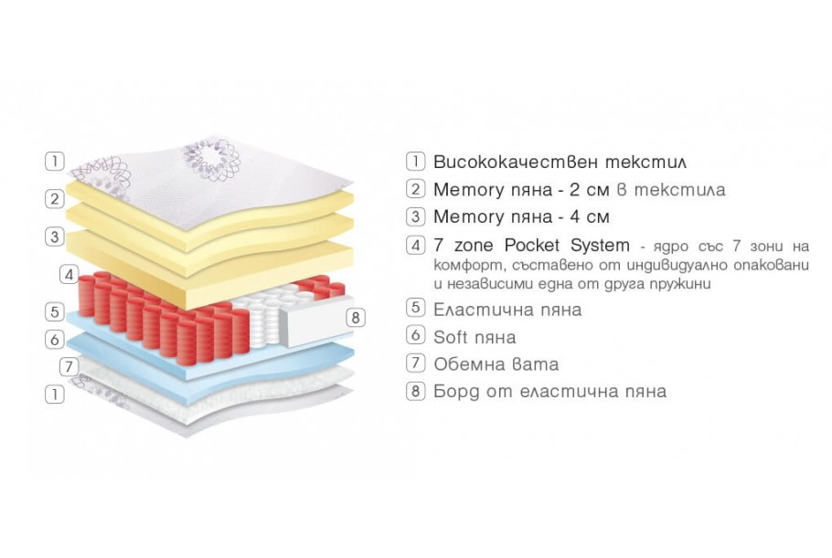 Състав на матрака: висококачествен капитониран текстил, Memory пяна, еластична пяна, 7 зонов Pocket System.