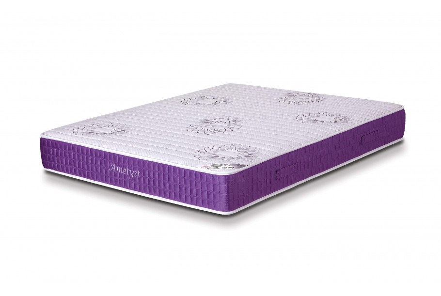 Модел Аметист съчетава неповторима визия и уникално усещане за комфорт. Съдържа седем зонов пружинен пакет Pocket System от индивидуално опаковани и независими една от друга пружини. Ядрото е със 7 зони на комфорт, подредени според специфичния натиск, който различните части на тялото упражняват върху повърхността на матрака. Това е една от най-добрите системи, съобразени с ергономията на човешкото тяло, която няма да загуби своите ортопедични качества в продължение на години. Аметист комбинира Memory пяна от едната страна на матрака, която се моделира според температурата на тялото, адаптира се към позицията му и помага за пълното му отпускане. Еластичната пяна от другата страна на матрака прецизно разпределя тежестта, като гарантира правилна позиция на гръбначния стълб. Избор на различно усещане за мекота и комфорт от двете страни на матрака.