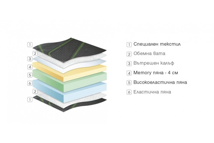Състав на матрака: висококачествен капитониран текстил, Memory пяна, високоеластична пяна, еластична пяна, вътрешен калъф, цип.