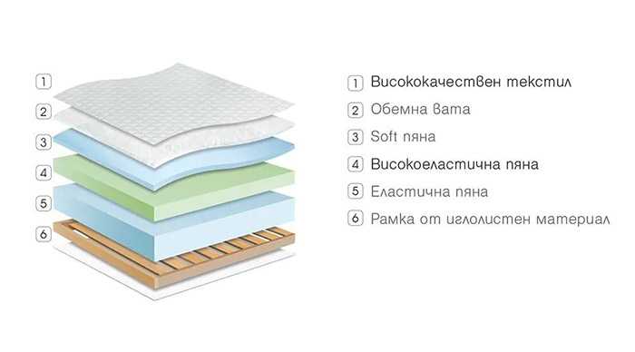 Състав на матрака: висококачествен капитониран текстил, високоеластична пяна, еластична пяна, вградена рамка от иглолистен материал.