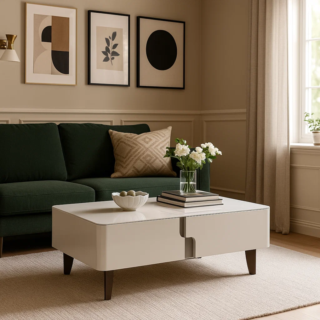 Холна маса LIORA – бял-капучино впечатлява с изчистен дизайн, модерна комбинация от цветове и практична функционалност. Плотът е изработен от устойчива керамика с мраморен ефект, което добавя изтънченост и лесна поддръжка, а четирите чекмеджета с корпуси от борова дървесина осигуряват дискретно място за съхранение на дребни вещи. МДФ основата и прахово боядисаните метални крака допринасят за стабилност и съвременно излъчване. Пълна информация за размерите и характеристиките на модела ще намерите в таблицата в таб/поле „Техническа информация“.