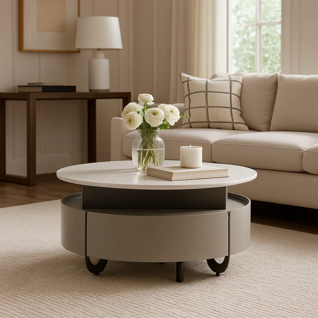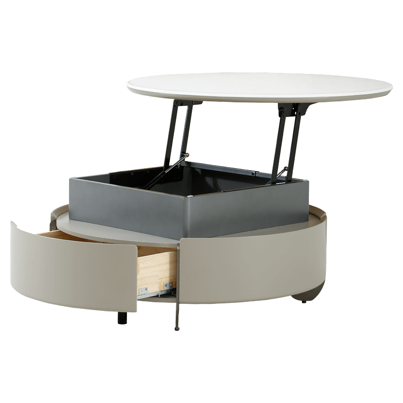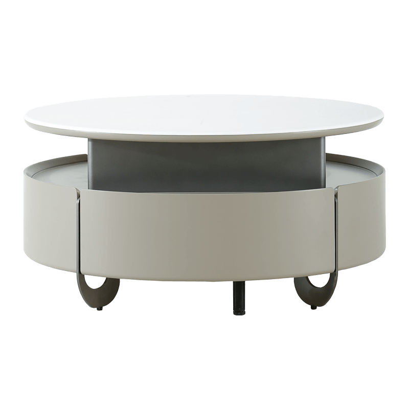 Холната маса TARIA впечатлява с кръгъл керамичен плот, издигащ се елегантно над основа от МДФ в цвят капучино. Освен изтънчения си външен вид, моделът предлага и практичност – плотът се повдига, откривайки скрито вътрешно отделение за съхранение, а двете чекмеджета корпус от борова дървесина плавно се отварят, за да осигурят още повече място за подредба. Стилният дизайн се допълва от извитите детайли и съвременната функционалност, която прави масата подходящ избор за модерна дневна. Пълна информация за размерите и характеристиките на модела ще намерите в таблицата в таб/поле „Техническа информация“.