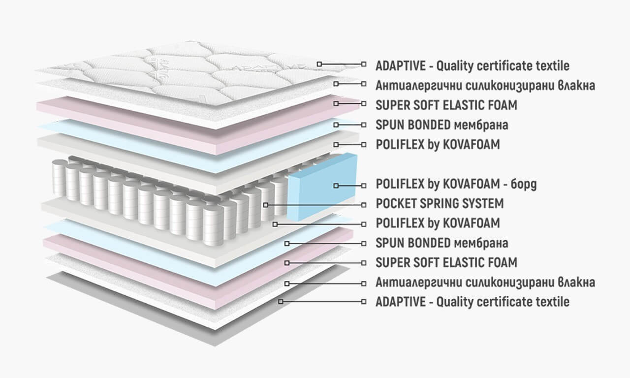 СЪСТАВ | СИСТЕМА ОТ ПОКЕТ ПРУЖИНИ | ПЕНОПОЛИУРЕТАНОВА ПЯНА | ВИСОКОКАЧЕСТВЕН СЕРТИФИЦИРАН ТЕКСТИЛ |