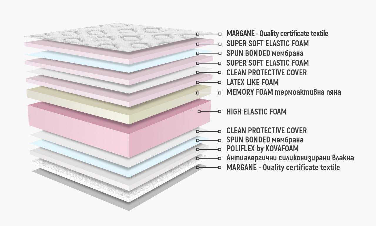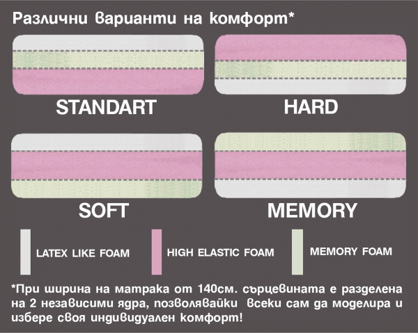 MEMORY FOAM, LATEX LIKEили HIGH ELASTIC FOAM– високо технологични и иновативни материи, съставляващи сърцевината на Вашия матрак. Чрез термоактивност, ортопедична твърдост или латексоподобна свръх мекота, слоевете предлагат мултизонална повърхност с гарантирана индивидуалност на чувствата по време на сън.