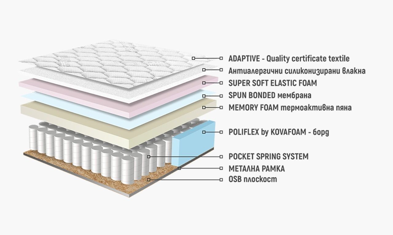 СЪСТАВ | МЕТАЛНА РАМКА | MEMORY FOAM ТЕРМОАКТИВНА ПЯНА | OSB ПЛОСКОСТ | СИСТЕМА ОТ ПОКЕТ ПРУЖИНИ | ПЕНОПОЛИУРЕТАНОВА ПЯНА | ВИСОКОКАЧЕСТВЕН СЕРТИФИЦИРАН ТЕКСТИЛ |