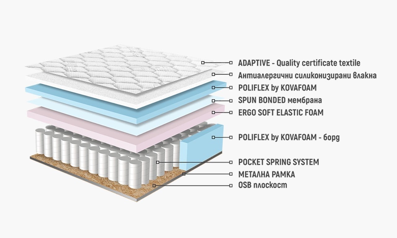 СЪСТАВ | МЕТАЛНА РАМКА | OSB ПЛОСКОСТ | СИСТЕМА ОТ ПОКЕТ ПРУЖИНИ | ПЕНОПОЛИУРЕТАНОВА ПЯНА | ВИСОКОКАЧЕСТВЕН СЕРТИФИЦИРАН ТЕКСТИЛ |