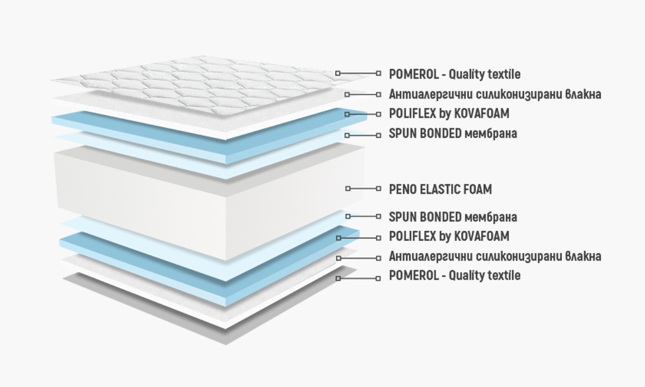| ПРЕДИМСТВА | ДВУЛИЦЕВ | БЕЗ ПРУЖИНИ | ДИШАЩ | НЕЗАВИСИМИ ОПОРНИ ТОЧКИ | ОРТОПЕДИЧЕН |