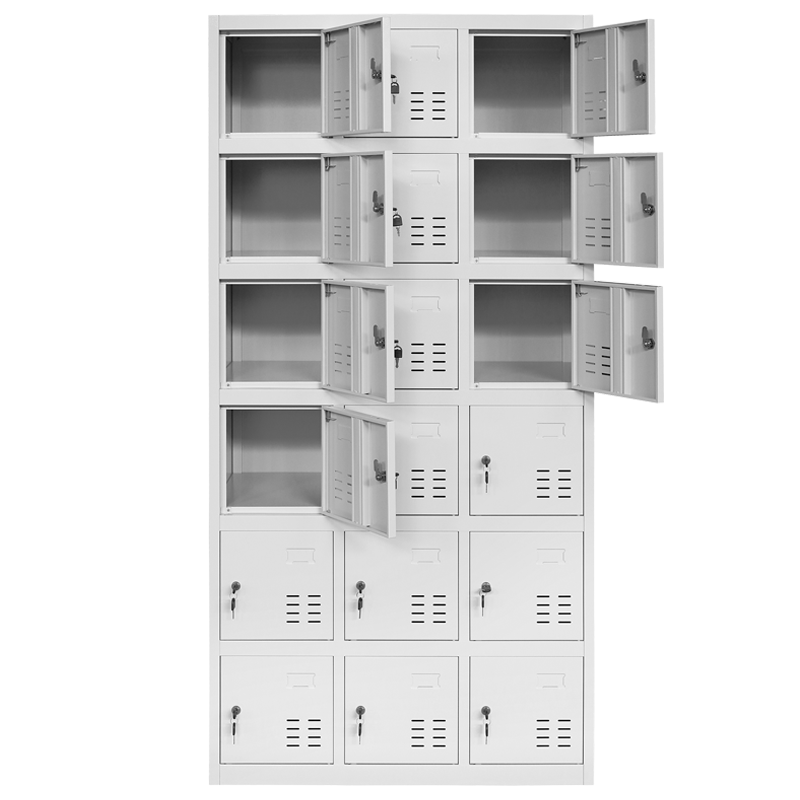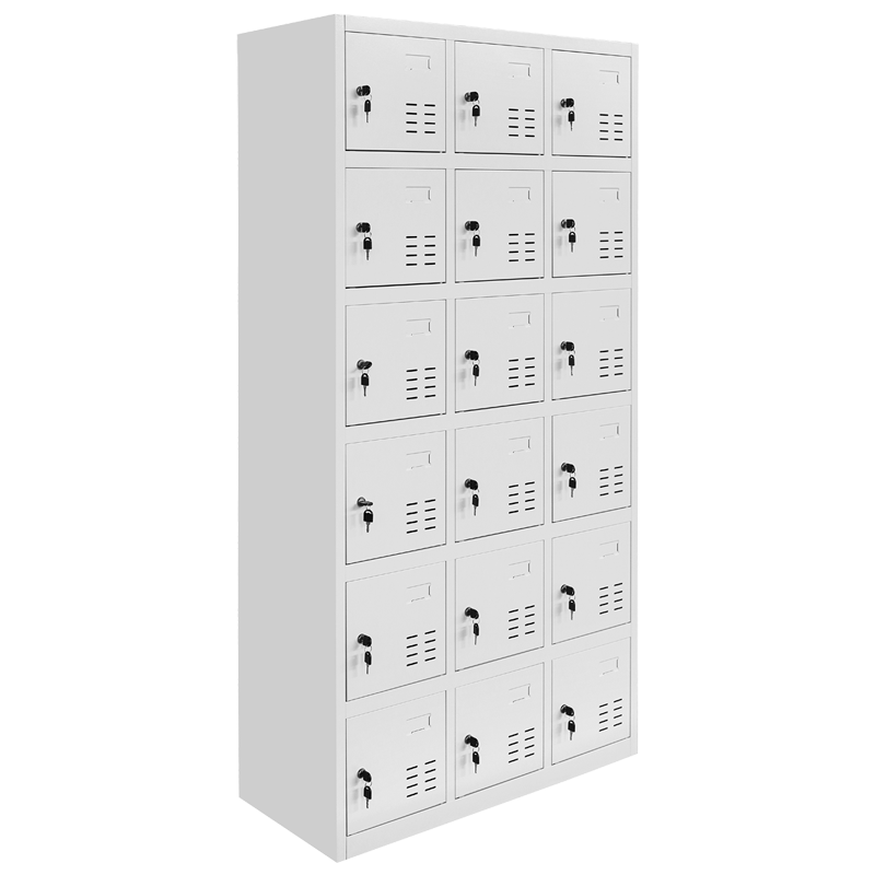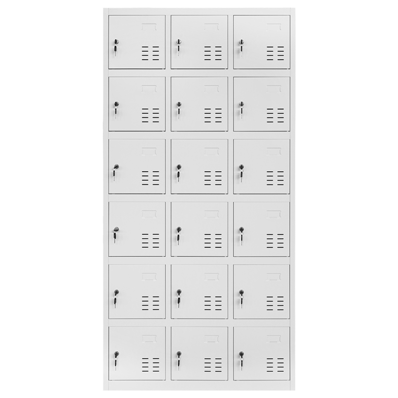 Метален шкаф Carmen CR-1261 ZHZ разполага с 18 индивидуални врати, всяка със собствено заключване с ключ. Подходящ е за съхранение на лични вещи в офиси, спортни зали, училища или съблекални. Конструкцията е компактна и стабилна, с вентилационни отвори за проветрение във всяко отделение. Пълна информация за размерите и характеристиките на модела ще намерите в таблицата в таб/поле „Техническа информация“.