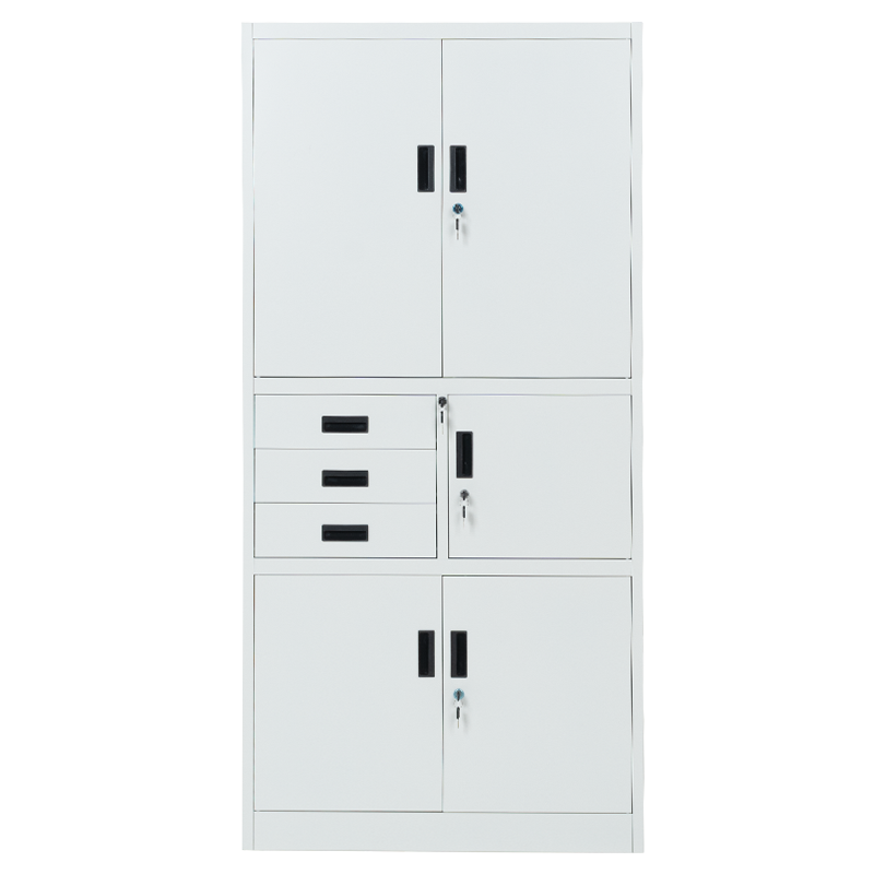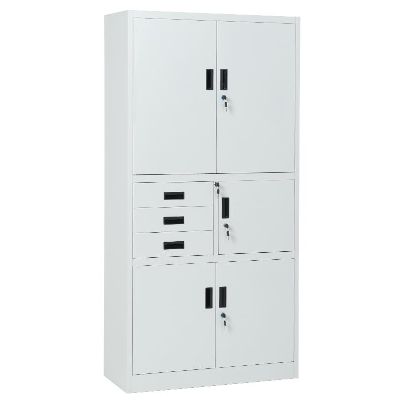 Carmen CR-1281 E K е метален шкаф за документи с удобно разпределение от две отделни шкафчета, 3 чекмеджета с общо заключване и 1 сейф. Всяко шкафче разполага с един рафт с регулируема височина и плътни врати със заключване. Пълна информация за размерите и характеристиките на модела ще намерите в таблицата в таб/поле „Техническа информация“.