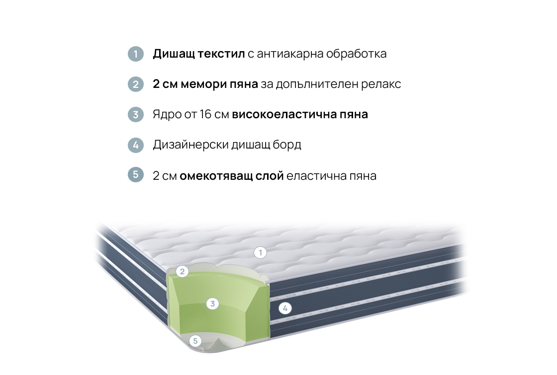 Сърцевината на матрака е от 100% високоеластична пяна с ортопедични характеристики. От двете му страни има по един допълнителен слой пяна – мемори пяна от едната страна и мека еластична пяна от другата. Можете да избрете предпочитана твърдост спрямо лицето на матрака. Двулицевите матраци могат да бъдат обръщани и завъртани, което допринася за по-дългия им период на употреба.