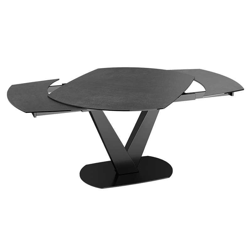 BELLAGIO е трапезна маса от висок клас с механизъм за разтягане. Плотът е изработен от керамика и закалено стъкло и е с дебелина 10 мм. В неразтегнато положение масата е с дължина 130 см, а ако очаквате повече гости, може да удължите плота до 190 см. За основата е използван стабилен праховобоядисан метал. Пълна информация за размерите и характеристиките на модела ще намерите в таблицата в таб/поле „Техническа информация“.