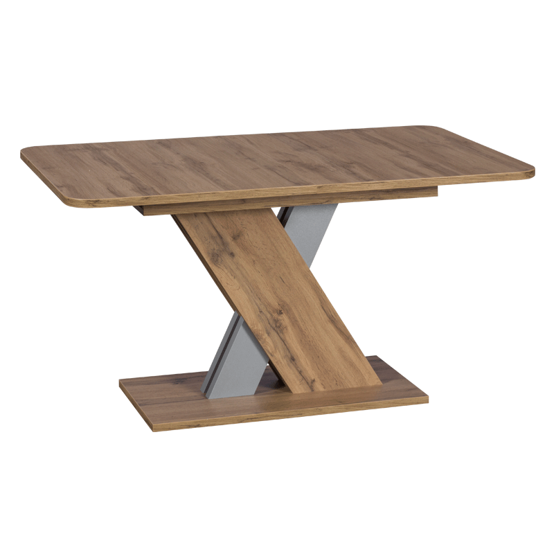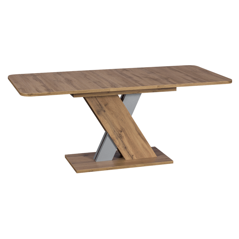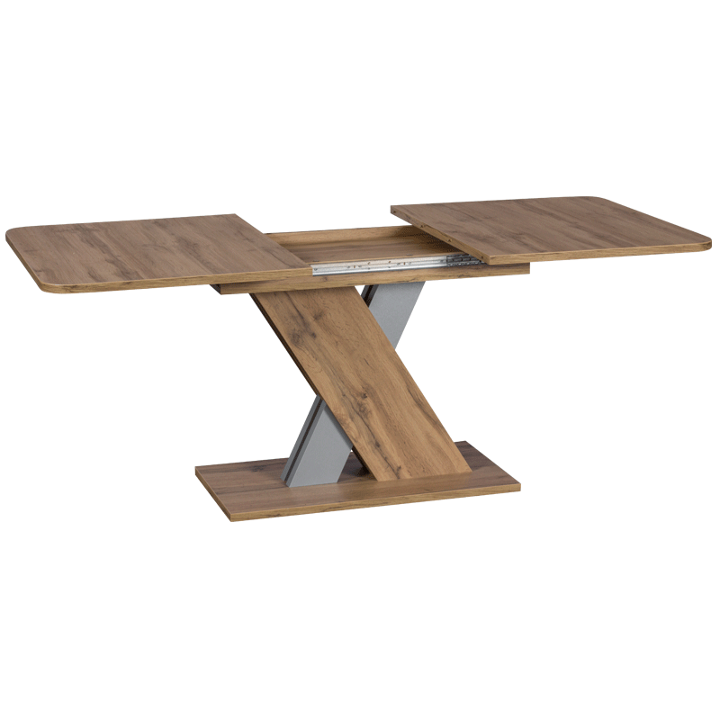 DINAR e модерна трапезна маса с функция за разтягане. Моделът е с интересна основа под формата на буквата Х. Плотът на масата е с дебелина 25 мм и размери 140 см. х 85 см. в стандартно положение и 180 х 85 см. при разтягане. Пълна информация за размерите и характеристиките на модела ще намерите в таблицата в таб/поле „Техническа информация“.