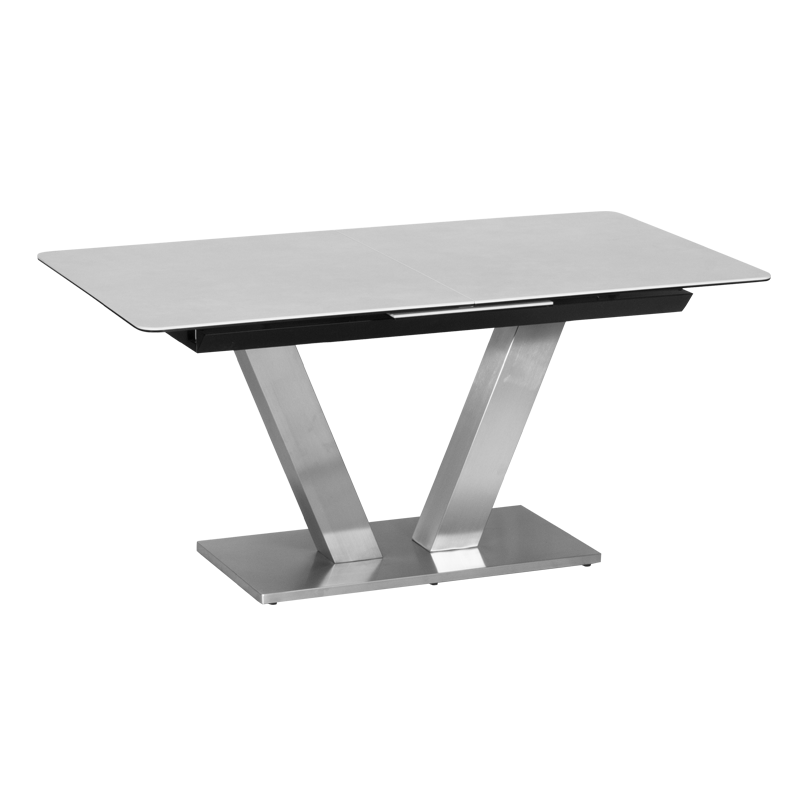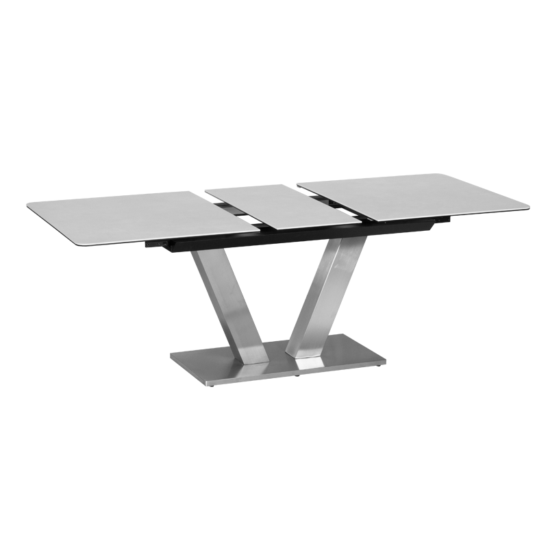 Разтегателната трапезна маса DUKLA впечатлява с модерен дизайн и висококачествена изработка. Плотът е от керамика и закалено стъкло, а основата от неръждаема стомана с изящен блясък, който създава усещане за лукс. Пълна информация за размерите и характеристиките на модела ще намерите в таблицата в таб/поле „Техническа информация“.