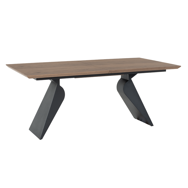 Разтегателна трапезна маса RATON впечатлява с модерен силует и функционален дизайн. Плотът е изработен от МДФ с естествен фурнир, с дебелина 25 мм, отличаващ се с издръжливост и гладка повърхност, която подчертава естествената текстура на дървото. Основата от праховобоядисан метал придава стабилност и характерен индустриален акцент. Масата разполага с механизъм за разтягане, чрез който дължината ѝ се увеличава от 180 до 240 см, осигурявайки удобно място за повече гости. Съчетава изчистена елегантност с практичност – идеален избор за съвременни трапезарии. Пълна информация за размерите и характеристиките на модела ще намерите в таблицата в таб/поле ‘Техническа информация’.