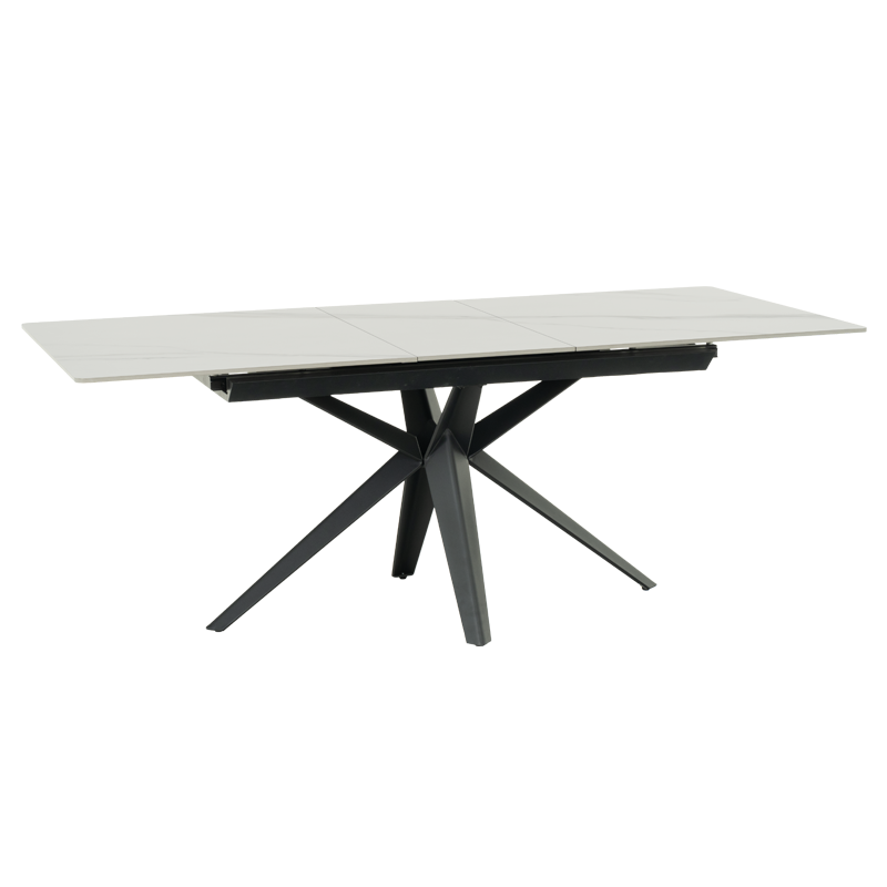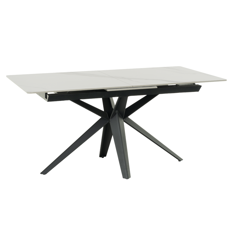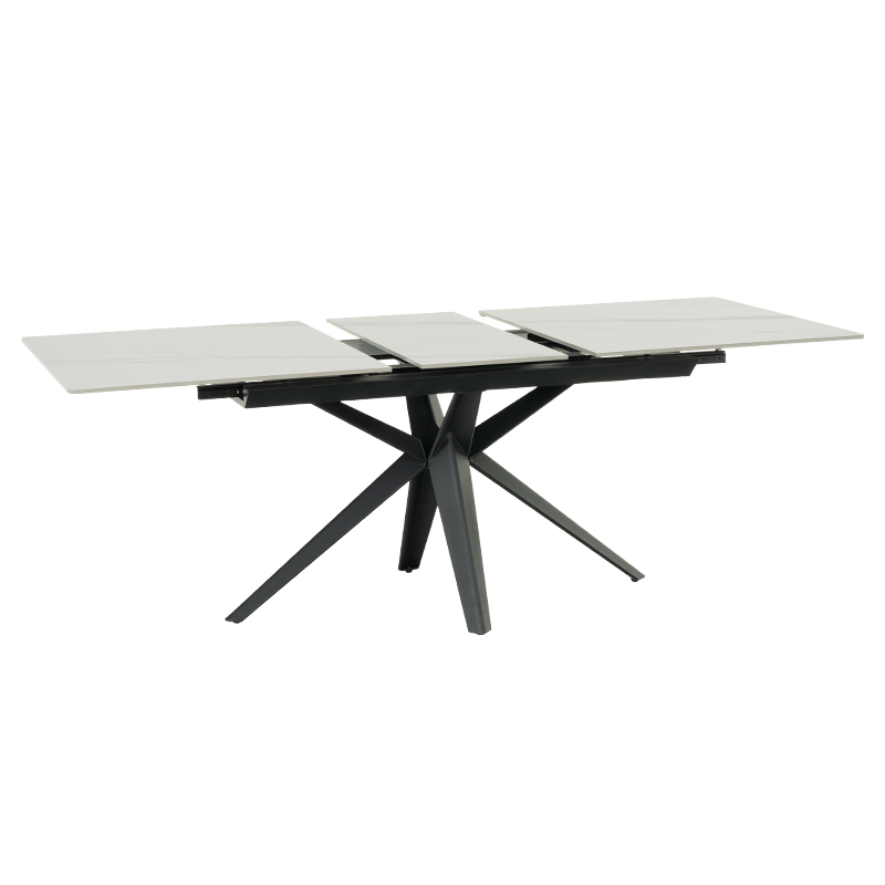 ZORY е трапезна маса с удобен разтегателен механизъм. Стилният ѝ дизайн я превръща в страхотен акцент за всеки дом. Керамичният плот е с дебелина 12 мм и със стандартен размер от 160 см, а при разтягане се удължава до 200 см. Така всеки гост или член на семейството ви ще се чувства комфортно. Разчупената метална основа осигурява стабилност и дълга експлоатация на масата. Пълна информация за размерите и характеристиките на модела ще намерите в таблицата в таб/поле „Техническа информация“.