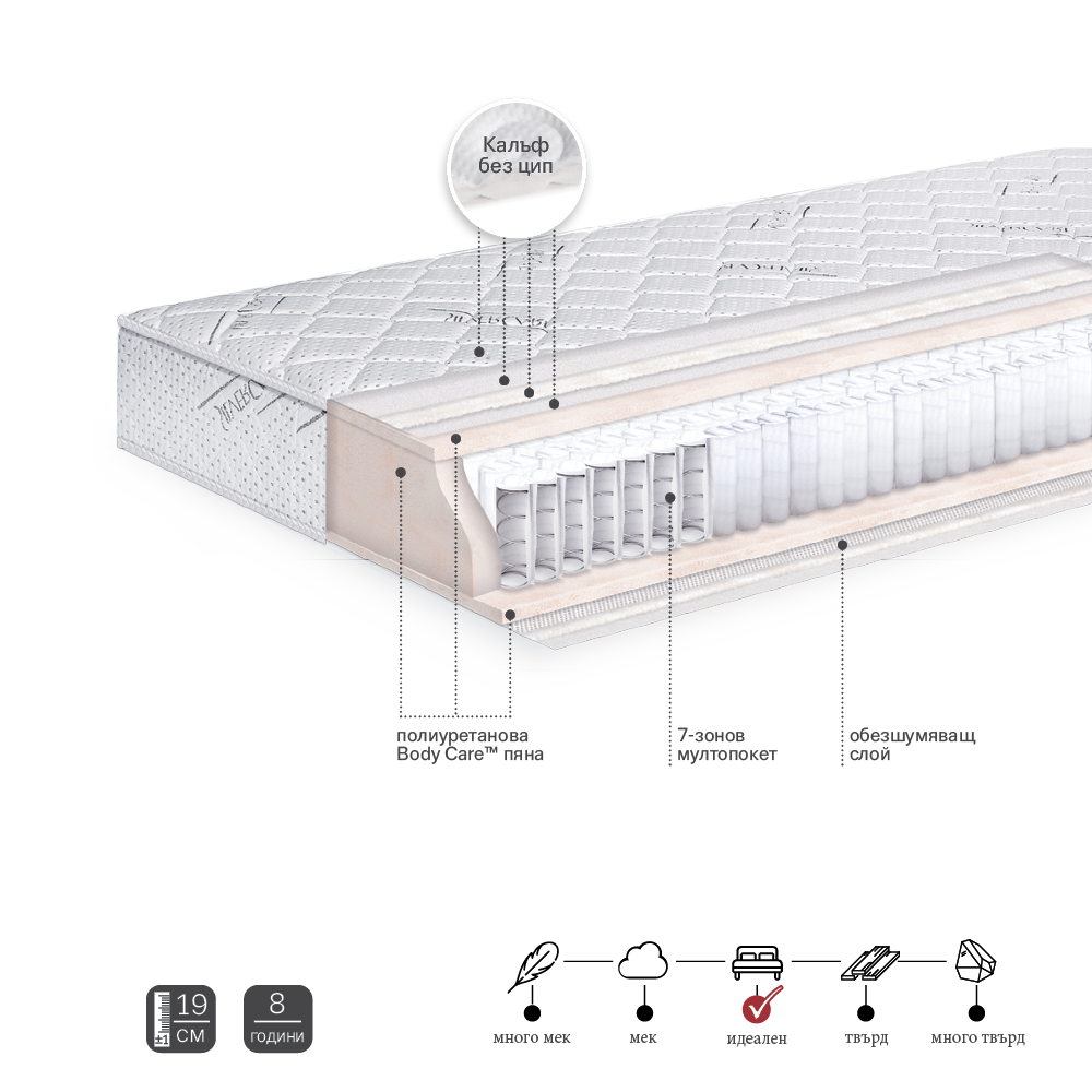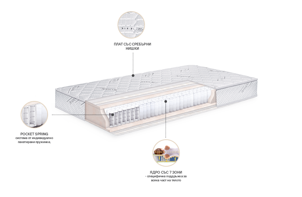 Прецизна опора и комфорт благодарение на 7-зонова мултипокет пружинна система, която със своите 500 независими опорни точки на кв.м. се адаптира адекватно спрямо оказания натиск. Обогатената с мемори пяна повърхност и специалният текстил със сребърни нишки носят усещане за лукс и комфорт в спалнята. Ядро: Мултипокет пружинна система, полиуретанова Body Care™ пяна. Калъф: текстил Silvercare, мемори пяна, прошит пух – полиуретанова и мемори пяна, влакна, нетъкан текстил.