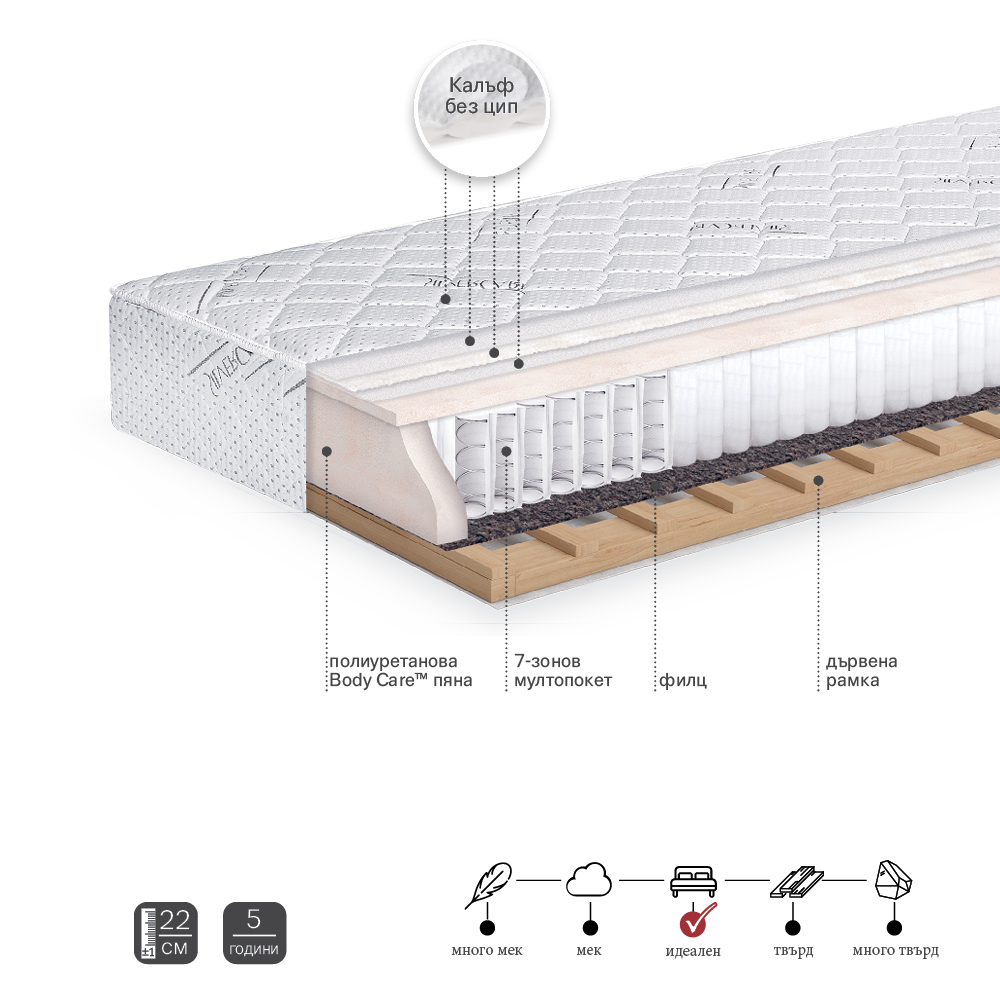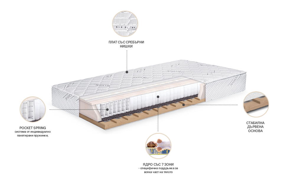Еднолицевият модел Exclusive Memory Silver е съчетание от 7-зонова мултипокет система, която разпределя равномерно тежестта на тялото и практична дървена рамка. Освен стабилна поддръжка с над 500 независими опорни точки на кв.м., матракът гарантира дълготраен комфорт благодарение на специално добавената мемори пяна и антибактериален текстил със сребърни нишки. Ядро: Мултипокет пружинна система, полиуретанова Body Care™ пяна; дървена рамка, обезшумяващ слой; Калъф: текстил Silvercare, мемори пяна, полиестерни влакна, нетъкан текстил.
