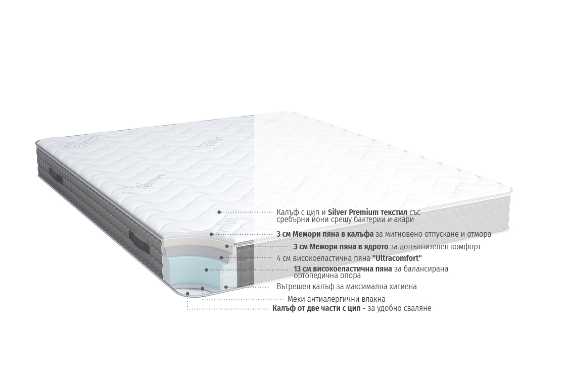 - Ядро с високоеластична пяна, слой мека еластична пяна и 3 см мемори