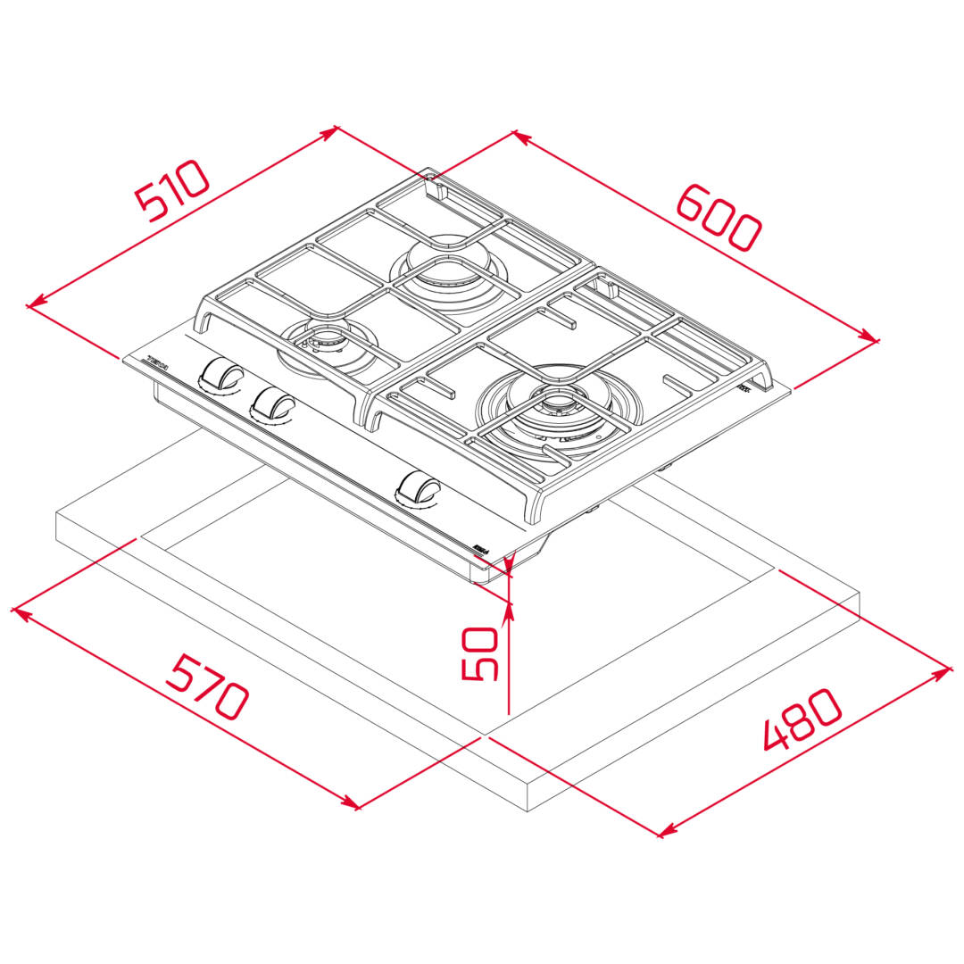 • 3 готварски зони: 1 двойна горелка 4 kW, 1 бърза горелка 2,8 kW, 1 горелка 1 kW