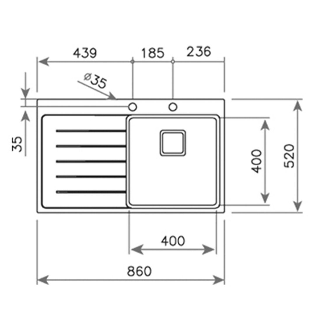Иноксова мивка за вграждане, гладка, ляв отцедник, авт. клапан, за шкаф със светъл отвор 50 см