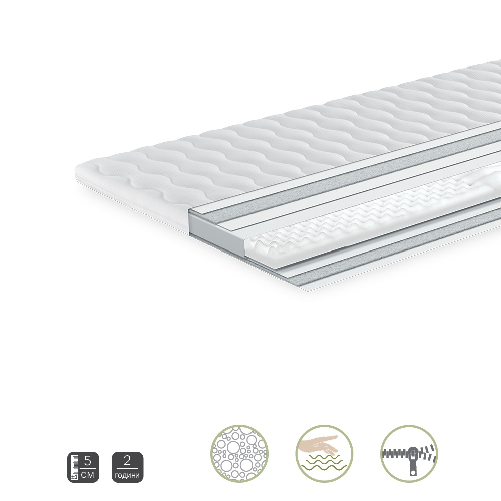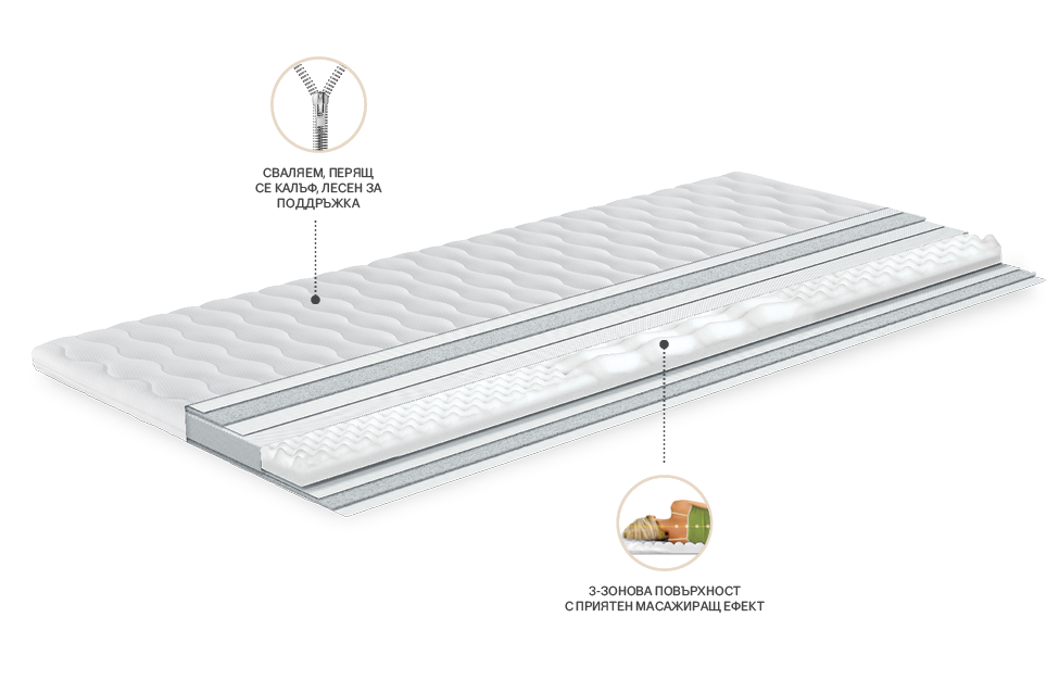 Ядрото от 3-зоново профилирана Body Care™ пяна , която лесно се адаптира към тялото. Повърхност с лек масажиращ ефект за регулиране на кръвообращението. Калъфът с цип допринася за лесната поддръжка и добрата хигиена. Ядро: 3-зоново профилирана Body Care™ пяна. Вътрешен калъф: нетъкан текстил. Калъф с цип: текстил 100% PES, полиестерни влакна, нетъкан текстил.