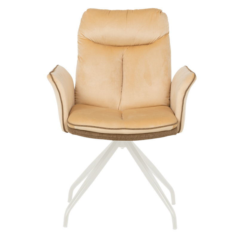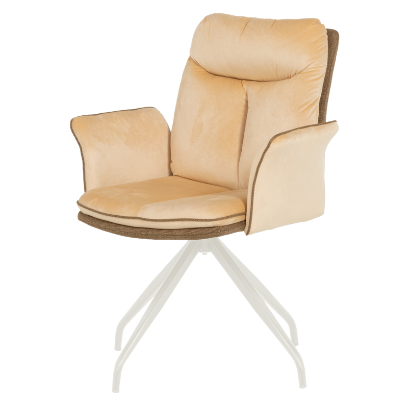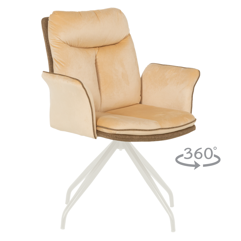 MARLOW 1 е трапезен стол с модерна визия. Той разполага с широки седалка и облегалка, тапицирани в мека дамаска, допълнени с възглавници за максимален комфорт. Подлакътниците повишават удобството на седящия. Основата е изработена от метал в елегантен кремав цвят и предлага иновативна функция за 360° въртене. Пълна информация за размерите и характеристиките на модела ще намерите в таблицата в таб/поле „Техническа информация“.