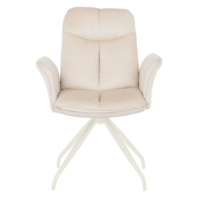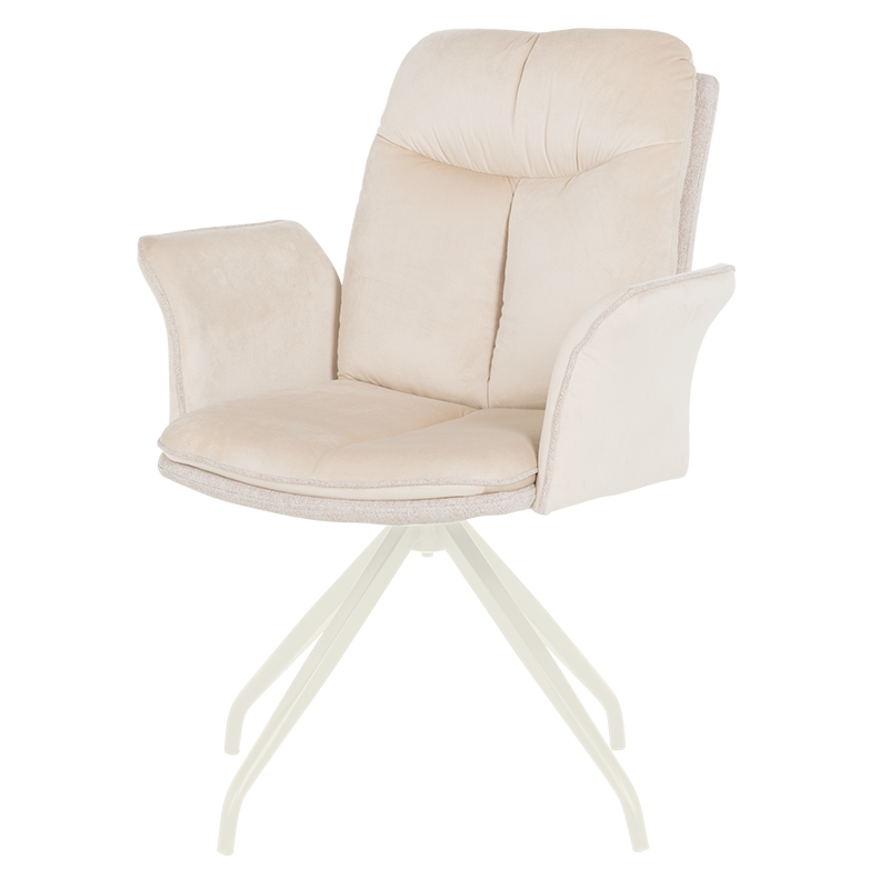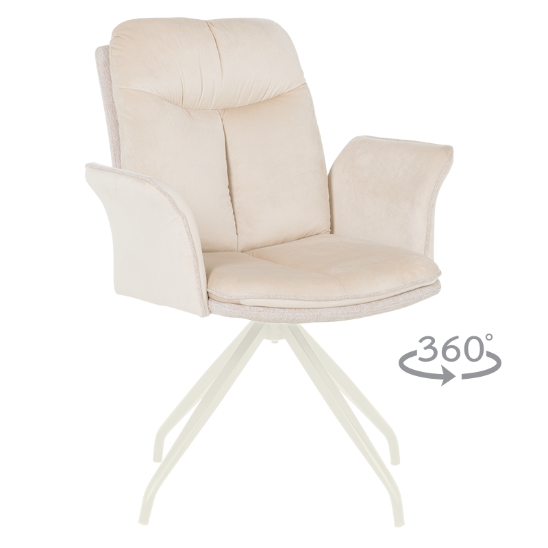 MARLOW 1 е трапезен стол с модерна визия. Той разполага с широки седалка и облегалка, тапицирани в мека дамаска, допълнени с възглавници за максимален комфорт. Подлакътниците повишават удобството на седящия. Основата е изработена от метал в елегантен кремав цвят и предлага иновативна функция за 360° въртене. Пълна информация за размерите и характеристиките на модела ще намерите в таблицата в таб/поле „Техническа информация“.