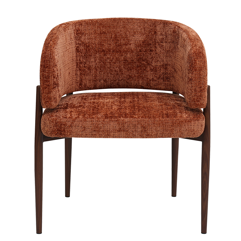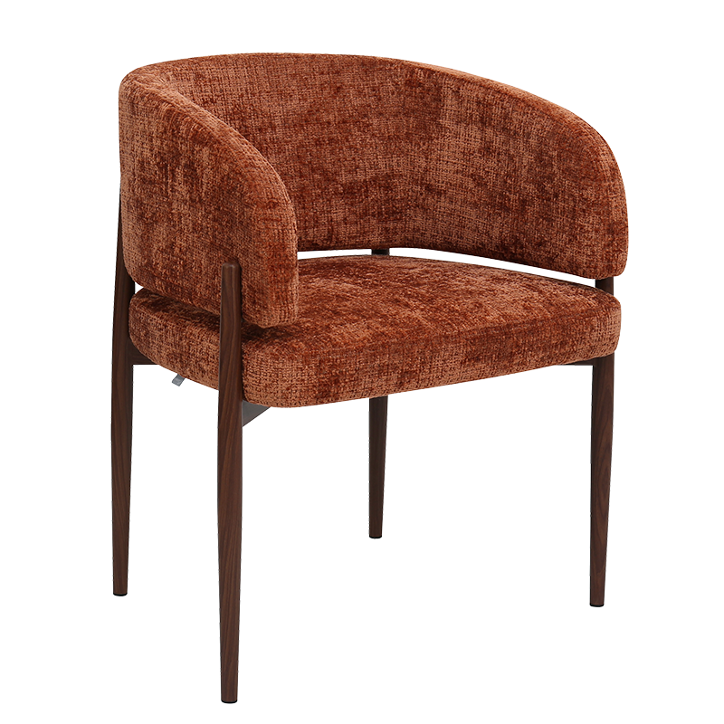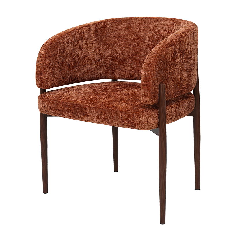 Трапезният стол RIMAR съчетава модерна визия с комфорт и прецизна изработка. Тапицираната седалка и облегалка с изчистени извивки осигуряват стабилна опора и приятна мекота при сядане. Издължените метални крака с праховобоядисано покритие в дървесен цвят допълват елегантния силует и придават изискан акцент на интериора. Пълна информация за размерите и характеристиките на модела ще намерите в таблицата в таб/поле „Техническа информация“.
