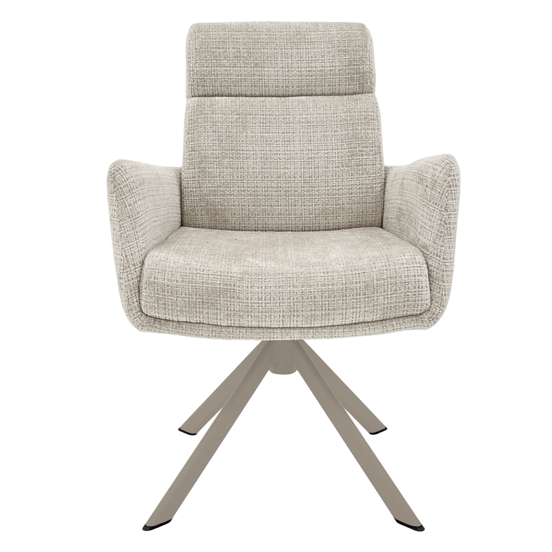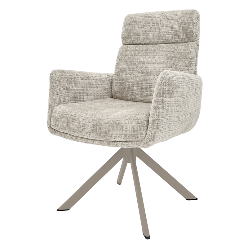 Трапезен стол TORVA е олицетворение на модерния комфорт, предлагайки елегантен дизайн с удобни подлакътници и мека тапицерия от издръжлива дамаска. За максимално удобство при продължително седене, седалката е подсилена със система от покет пружини и разполага с функция за люлеене. Здравата основа от праховобоядисан метал позволява пълно въртене на 360° и включва механизъм за автоматично връщане в изходна позиция. Този стол е създаден да издържи на натоварване до 120 кг, което го прави отличен и стабилен избор за всяка съвременна трапезария. Пълна информация за размерите и характеристиките на модела ще намерите в таблицата в таб/поле „Техническа информация“.