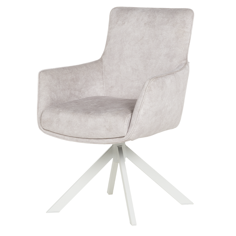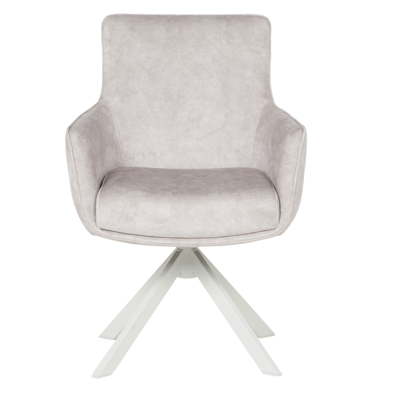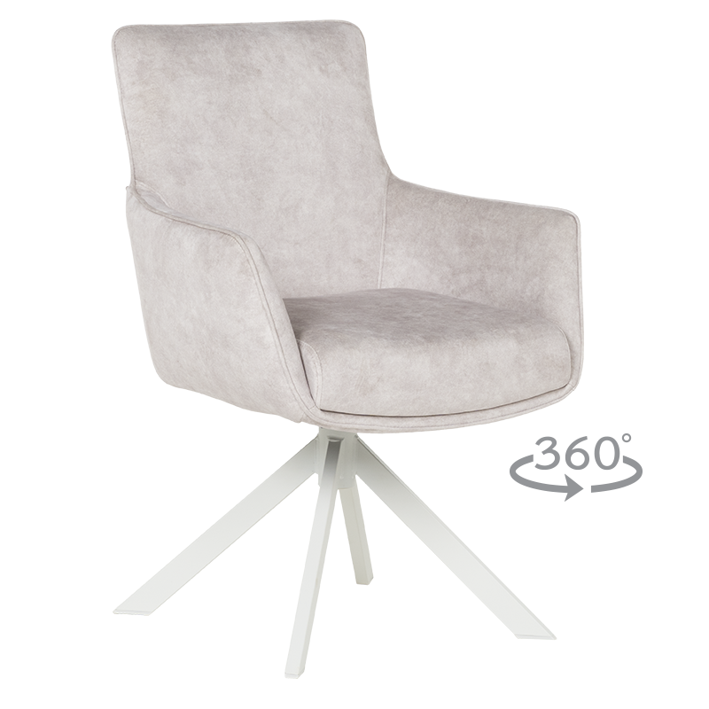 Стилният трапезен стол VALGA 6 впечатлява със своя модерен дизайн и изключителен комфорт. Седалката е тапицирана с висококачествена дамаска и оборудвана с покет пружини, осигуряващи удобство при продължителна употреба. Подлакътниците добавят допълнително усещане за уют, правейки стола подходящ както за хранене, така и за почивка. Уникалната функция за въртене на 360° с автоматично връщане в изходна позиция го прави изключително практичен, а масивната основа от праховобоядисан метал в кашмирено бяло добавя нотка на елегантност. Люлеещият механизъм създава релаксиращо изживяване, което прави стол VALGA 6 идеален избор за модерната трапезария