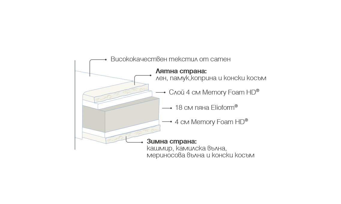 Лятната е от висококачествен текстил, който предлага прохлада чрез състава си от памук, лен и коприна. Най-горният слой на текстила е от премиум сатен. Тези материали са естествен антиалерген с изключителна мекота и издръжливост и висока абсорбираща способност, която не позволява задържането на влага.