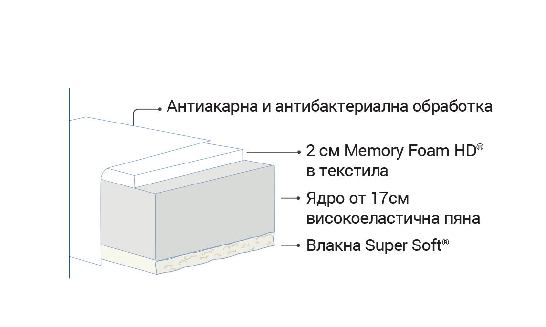 Vivo съчетава ядро от 17 см. високоеластична пяна и слой мемори пяна от едната страна. Предоставя здравословна, ортопедична опора, която поддържа гръбнака в правилна позиция по време на сън. При матраците на Magniflex с Memory Foam HD® ще усетите отпускане веднага след като легнете. Този материал разпределя равномерно тежестта на тялото, което облекчава дискомфорта раменете, кръста и краката.